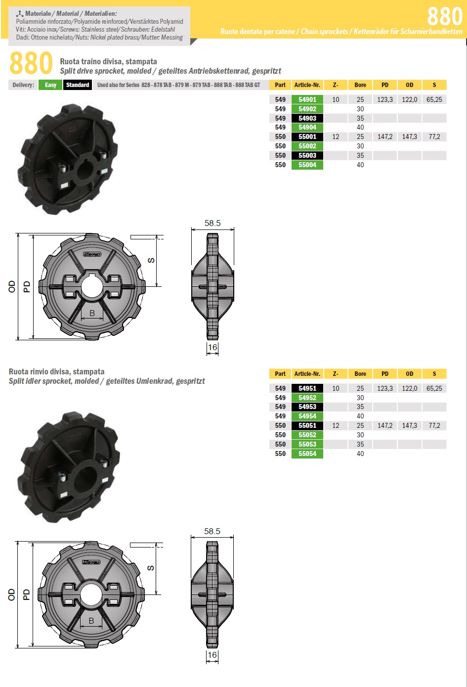 Цепная конвейерная звездочка 880 серии изготавливается из высококачественной армированной пластмассы. Применяются для конвейеров с пластинчатыми цепями. Подходят для применения с лентами и цепями 828-878TAB-879M-879TAB-888TAB-888TAB GT.