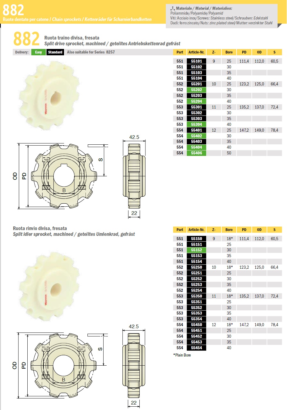 Ведущие и ведомые звездочки 882 выпускаются максимальным диаметром 149мм, толщиной 42.5 мм (подробнее в характеристиках).