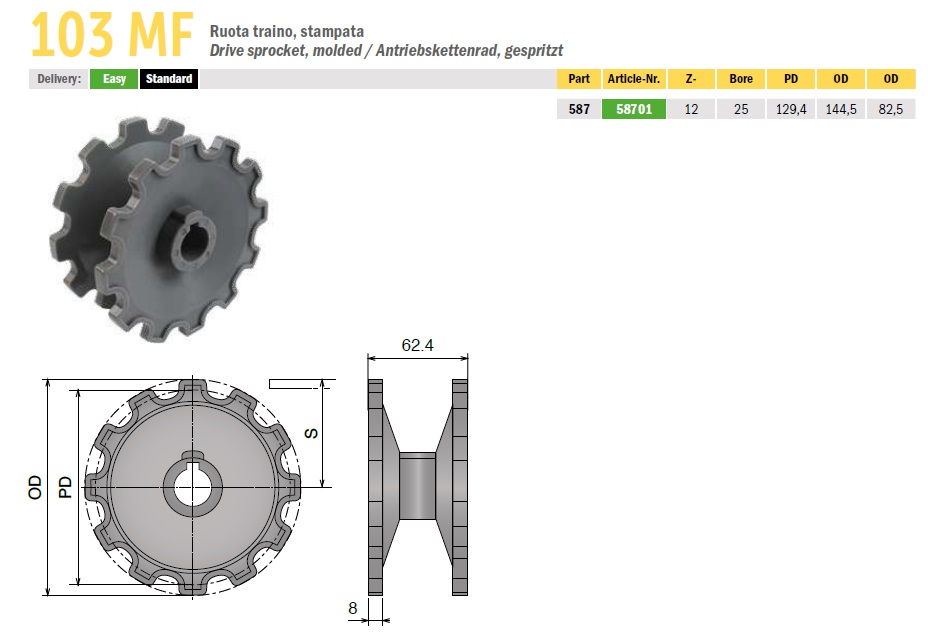 Ведущие и ведомые звездочки 103MF выпускаются максимальным диаметром 144.5мм, толщиной 62.4мм (подробнее в характеристиках).