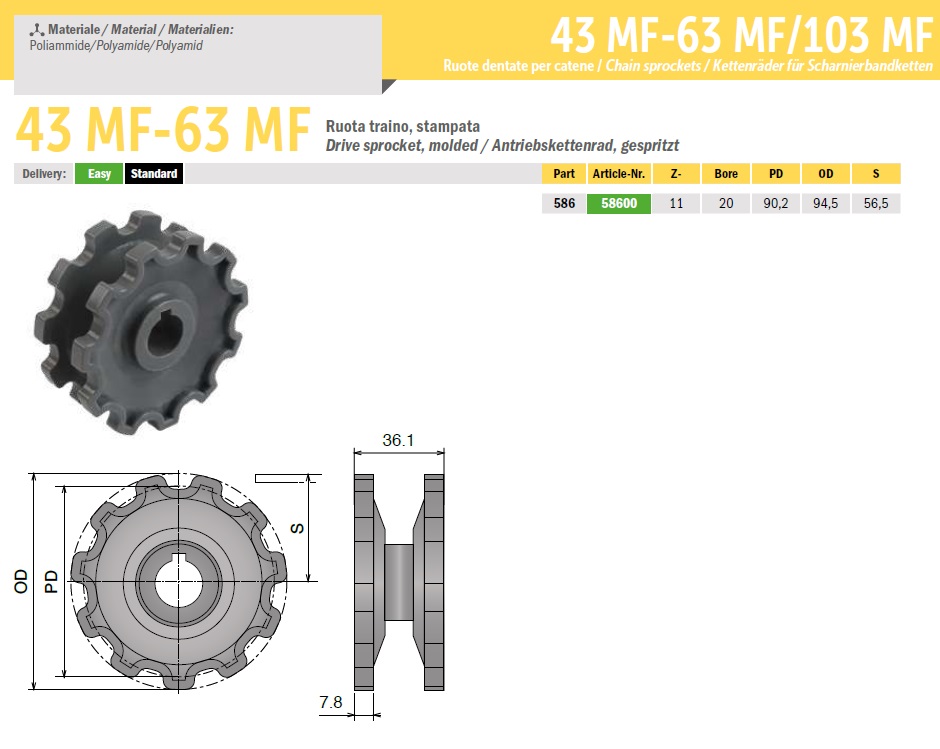 Конвейерная звездочка 43 MF-63 MF применяется для пластиковых цепей с шарнирным креплением. Изготавливается из высококачественной армированной пластмассы. Применяются с пластинчатыми цепями, имеющими плоскую поверхность.
