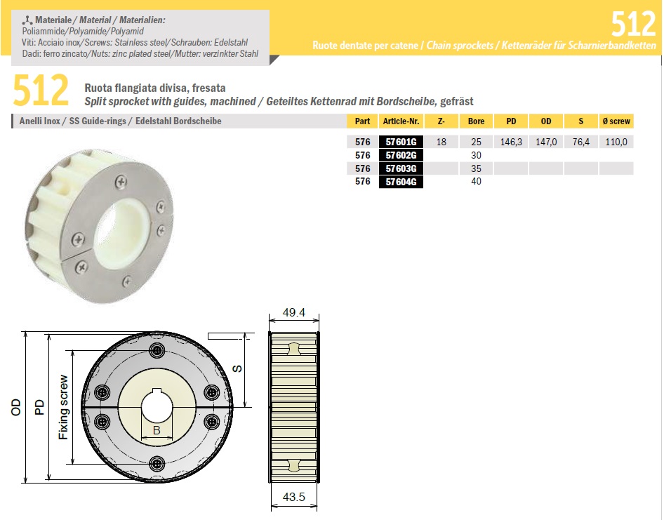 Ведущие и ведомые звездочки 512 выпускаются максимальным диаметром 147мм, толщиной 49.4мм (подробнее в характеристиках).