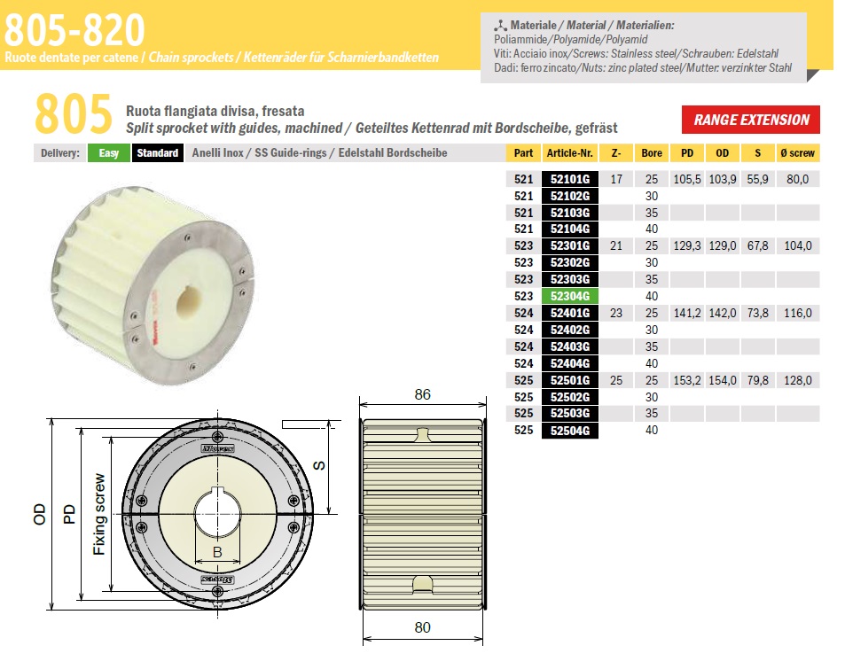 Ведущие и ведомые звездочки 805 выпускаются максимальным диаметром 154мм, толщиной 86мм (подробнее в характеристиках).