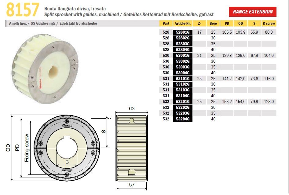 Ведущие и ведомые звездочки 8157 выпускаются максимальным диаметром 154мм, толщиной 63мм (подробнее в характеристиках).