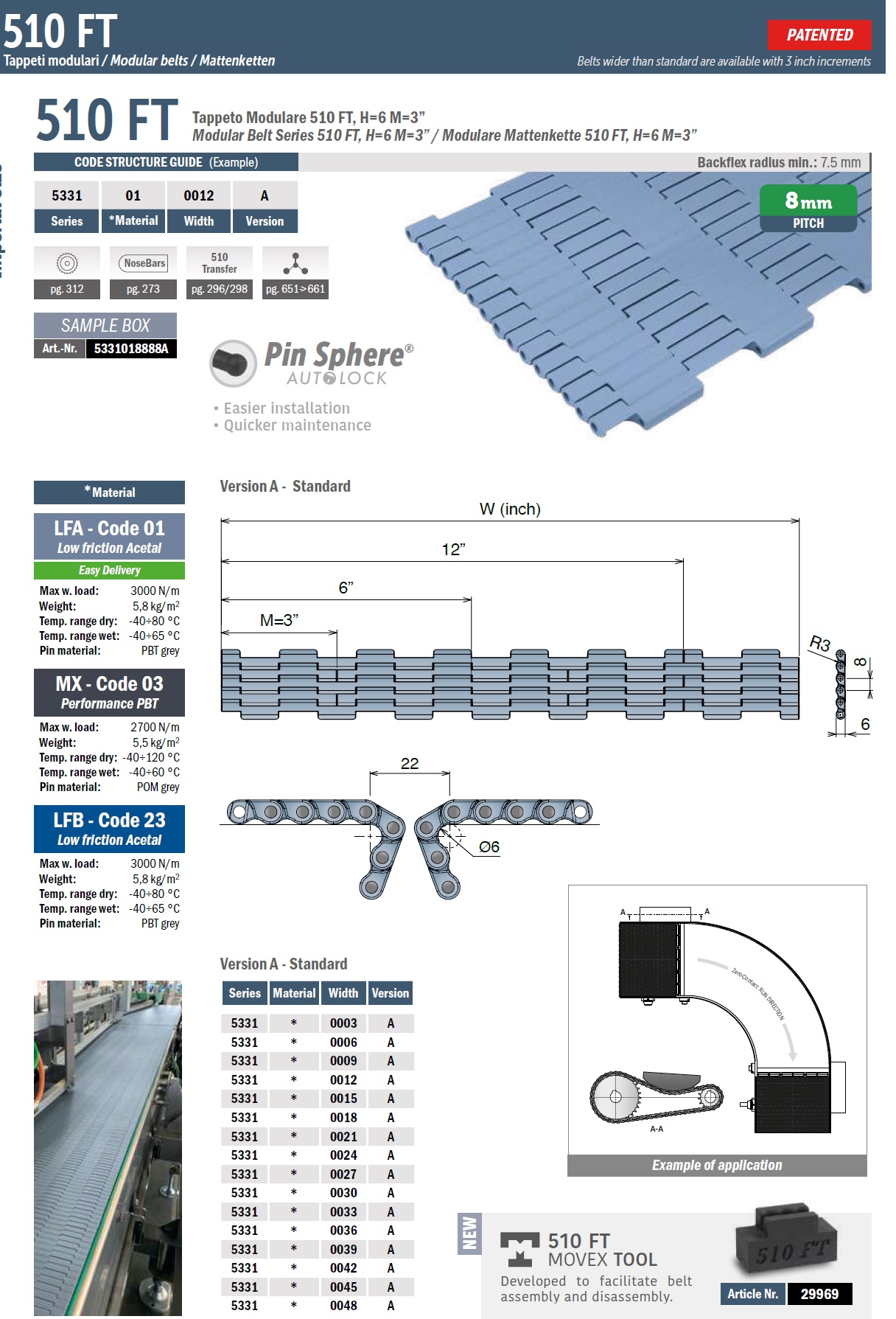 Модульная транспортерная лента 510FT Movex — набор пластинчатых элементов (модулей), соединенных между собой в непрерывную конвейерную ленту.