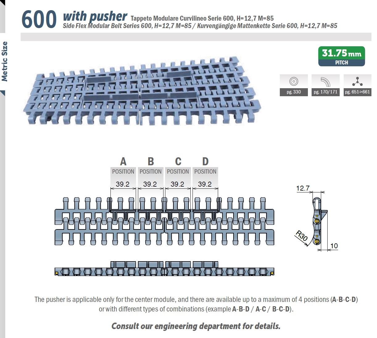 Модульная лента Movex 600 с толкателем, поворотная, H=12,7 M=85