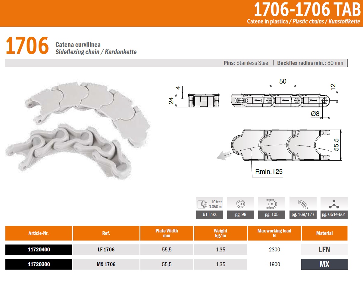 Поворотная цепь 1706 поставляется в рулоне намоткой 3.05 метра (61 элементов). Ширина 55.5мм (подробнее в характеристиках). Максимальная нагрузка 2300Н, радиус поворота 125мм. Уменьшен зазор между звеньями, а контактная поверхность увеличилась максимум до 15%.