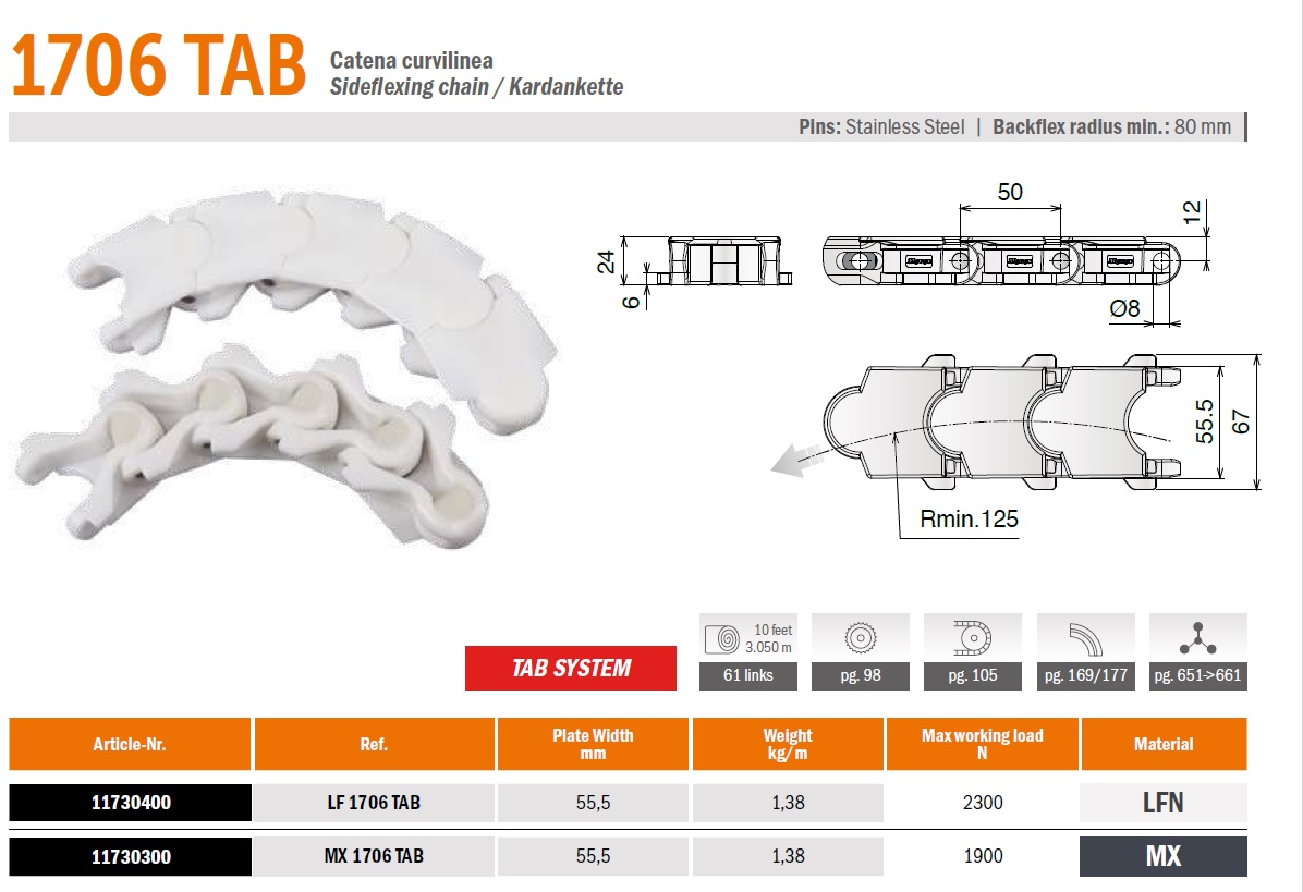 Поворотная цепь 1706 TAB поставляется в рулоне намоткой 3.05 метра (61 элементов). Ширина 67мм (подробнее в характеристиках). Максимальная нагрузка 2300Н, радиус поворота 125мм. Уменьшен зазор между звеньями, а контактная поверхность увеличилась максимум до 15%.
