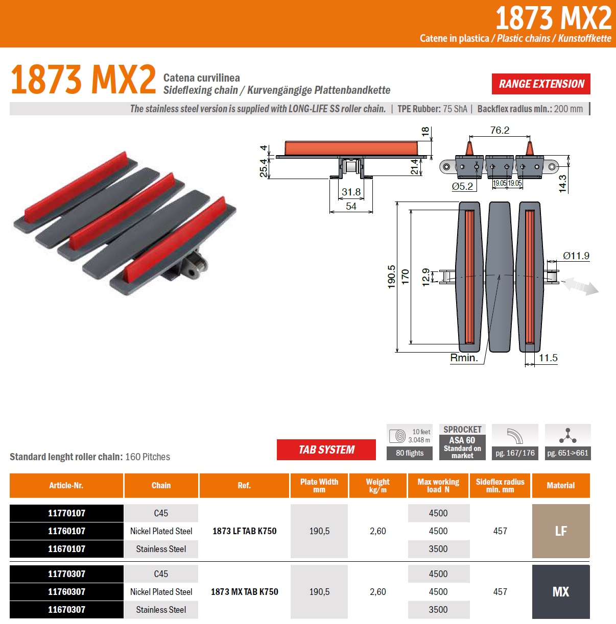 Поворотная пластинчатая цепь 1873MX2 поставляется в рулоне намоткой 3.048 метра (80 элементов). Ширина ленты 190.5мм (подробнее в характеристиках). Максимальная нагрузка 4500Н, радиус поворота 457мм. Уменьшен зазор между звеньями, а контактная поверхность увеличилась максимум до 15%. Роликовая цепь стандартной длины: 160 звеньев.