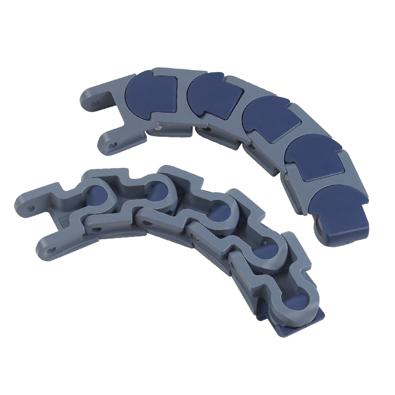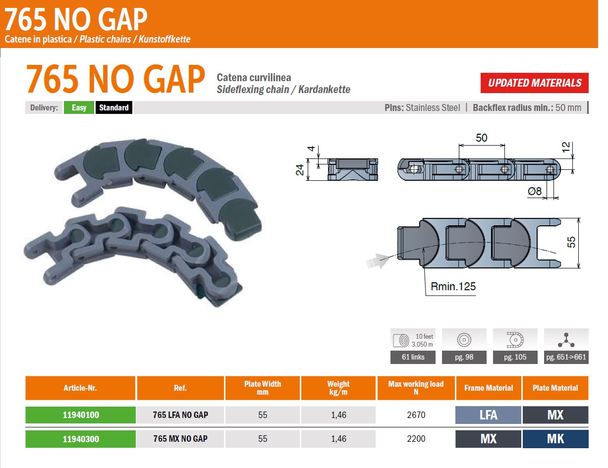 Поворотная цепь 765 NO GAP поставляется в рулоне намоткой 3.05 метра (61 элементов). Ширина 55мм (подробнее в характеристиках). Максимальная нагрузка 2670Н, радиус поворота 125мм. Шаг между звеньями 50мм. Уменьшен зазор между звеньями, а контактная поверхность увеличилась максимум до 15%.