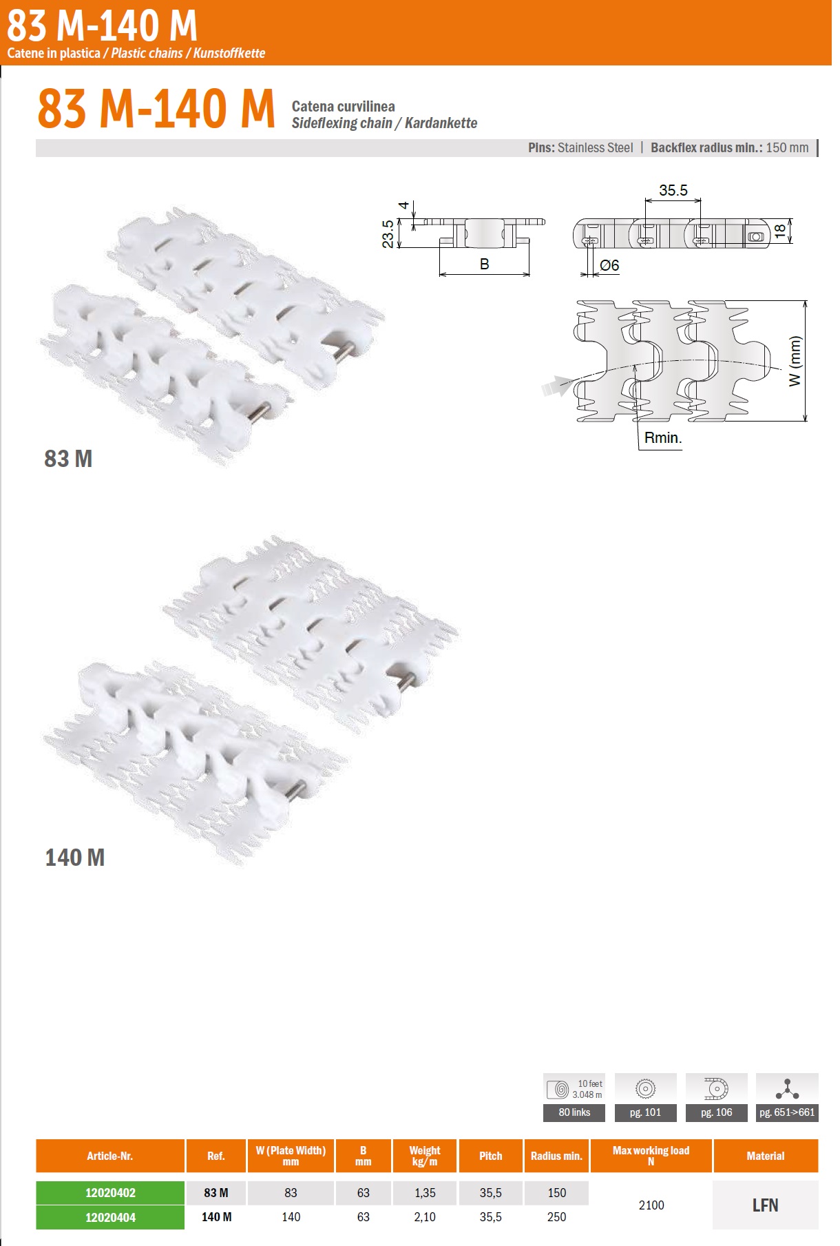 Поворотные цепи 83 M, 140 M имеют ширину 83мм-140мм (подробнее в характеристиках). Максимальная нагрузка 2100Н, радиус поворота до 250мм.