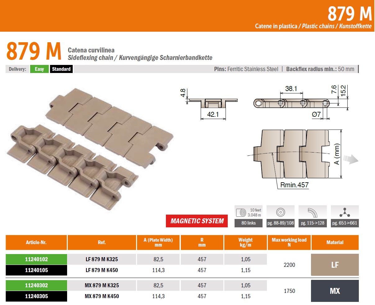 Поворотная пластинчатая цепь 879 M поставляется в рулоне намоткой 3.048 метра. В зависимости от модификации ширина ленты 82.5мм или 114.3мм (подробнее в характеристиках). Максимальная нагрузка 2200Н, радиус поворота от 457мм. Уменьшен зазор между звеньями, а контактная поверхность увеличилась максимум до 15%. Для соединения элементов используются металлические штифты.