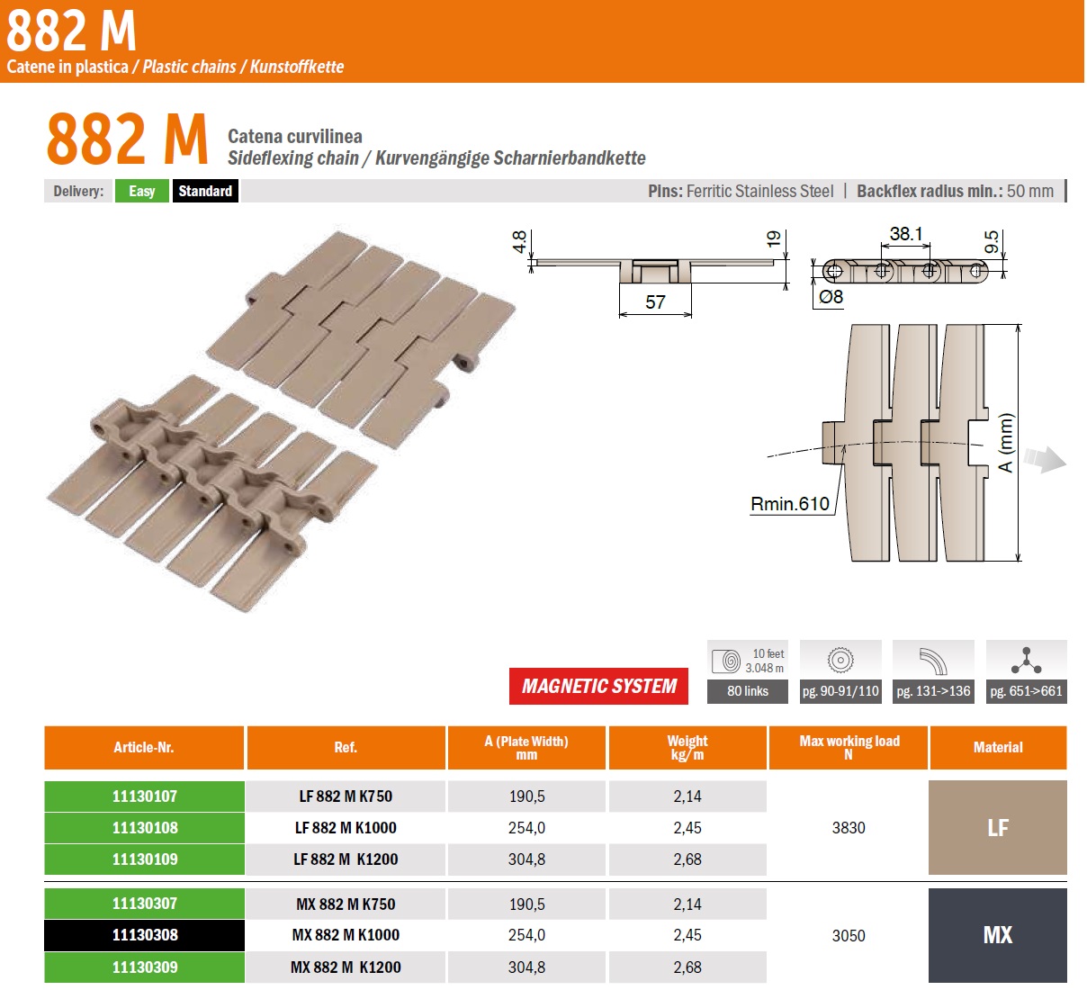 Поворотная пластинчатая цепь 882 M поставляется в рулоне намоткой 3.048 метра. В зависимости от модификации ширина ленты 190.5 — 304.8мм (подробнее в характеристиках). Максимальная нагрузка 3830Н, радиус поворота до 610мм. Уменьшен зазор между звеньями, а контактная поверхность увеличилась максимум до 15%. Для соединения элементов используются металлические штифты.