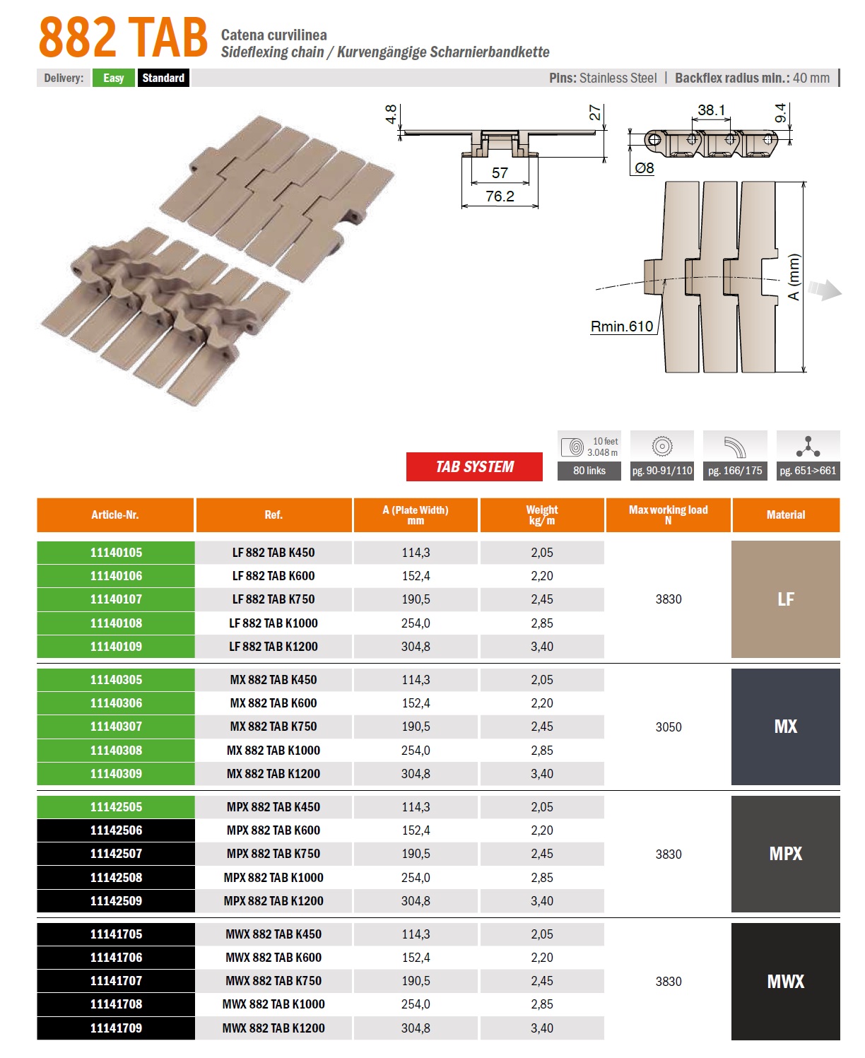 Поворотная пластинчатая цепь 882 TAB поставляется в рулоне намоткой 3.048 метра (80 элементов). В зависимости от модификации ширина ленты 114.3 — 304.8мм (подробнее в характеристиках). Максимальная нагрузка 3830Н, радиус поворота до 610мм. Уменьшен зазор между звеньями, а контактная поверхность увеличилась максимум до 15%. Для соединения элементов используются металлические штифты.