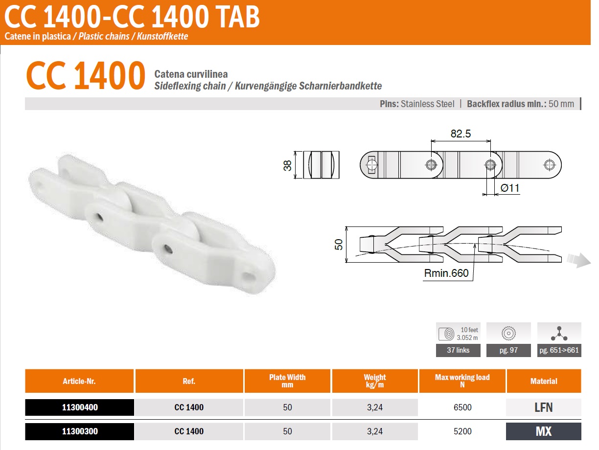 Поворотная цепь CC 1400 поставляется в рулоне намоткой 3.052 метра (37 элементов). Ширина 50мм (подробнее в характеристиках). Максимальная нагрузка 6500Н, радиус поворота 660мм. Уменьшен зазор между звеньями, а контактная поверхность увеличилась максимум до 15%.