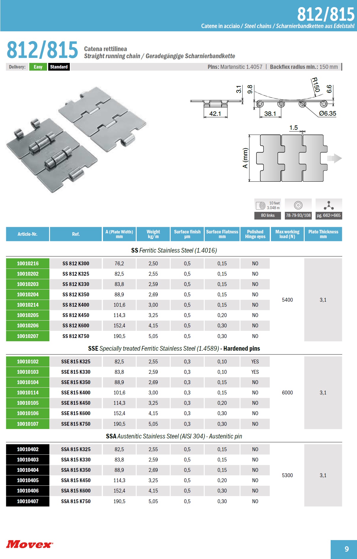 Прямоходная пластинчатая цепь Movex серии 812/815 выполнена из стали. Доступны три модификации: