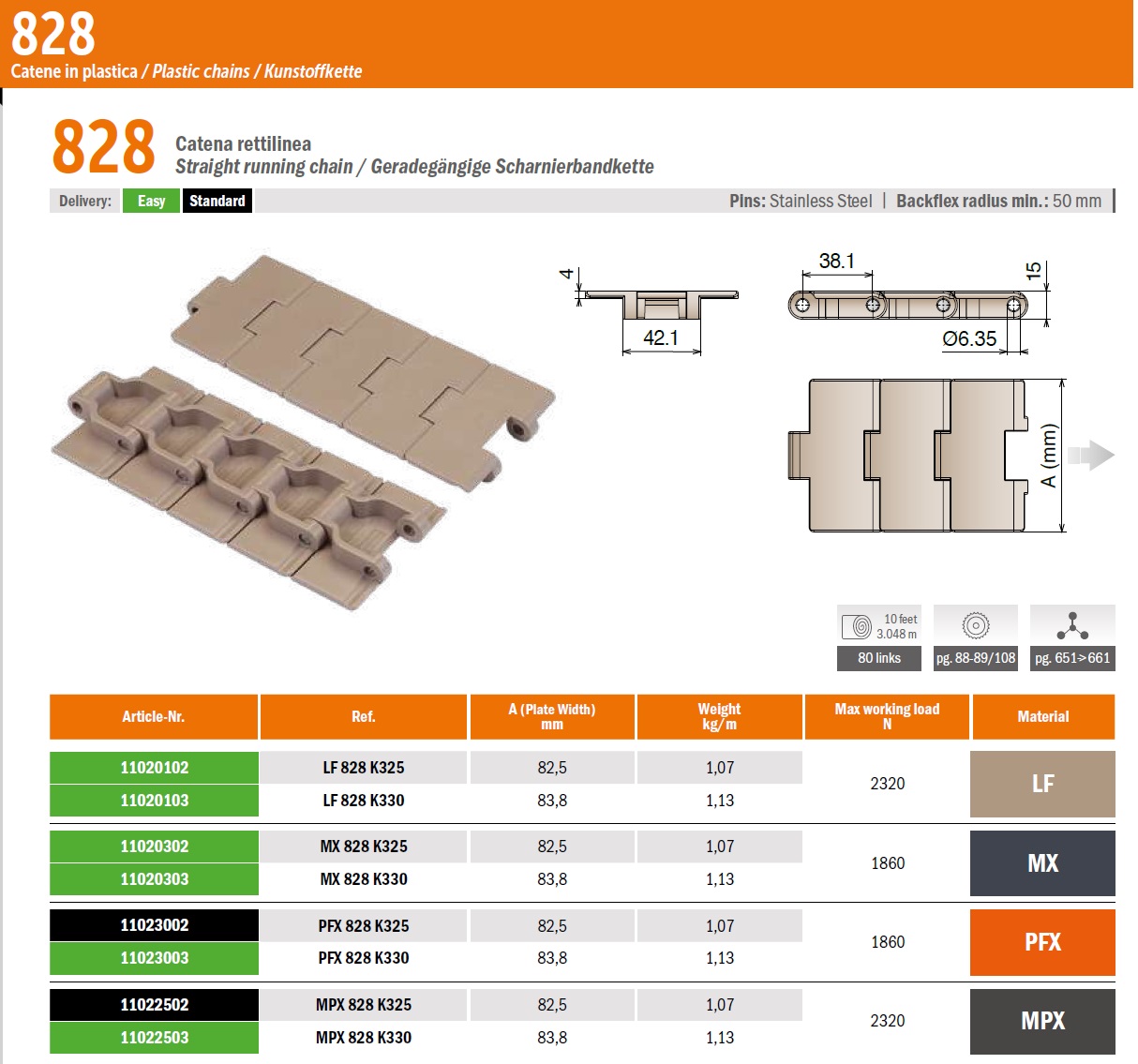 Прямоходная пластиковая цепь 828 поставляется в рулоне намоткой 3.048 метра. В зависимости от модификации ширина ленты 82.5мм или 83.8мм (подробнее в характеристиках). Уменьшен зазор между звеньями, а контактная поверхность увеличилась