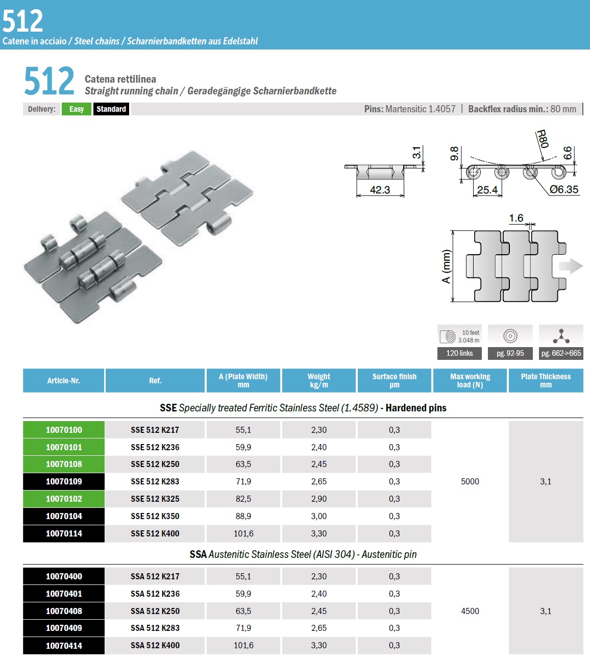 Прямоходная пластинчатая конвейерная цепь Movex серии 512. Производится из нержавеющей стали, толщина элемента 3.1 мм. Ширина пластины в зависимости от модели варьируется в пределах 55.1-101.6мм (подробно в характеристиках). Максимально допустимая нагрузка 4500-5000 Н.