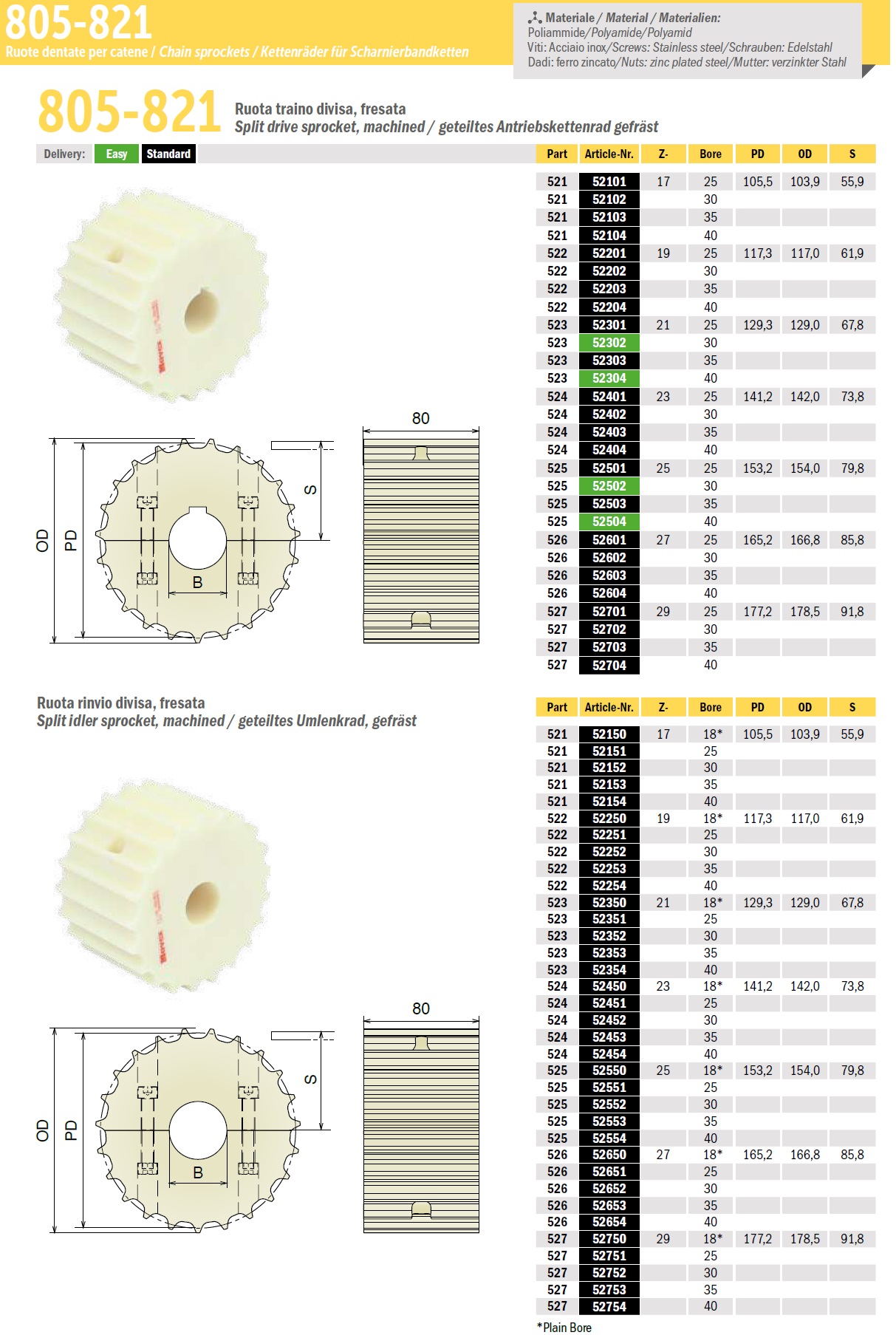 Приводная ведущая звездочка 805-821 серии изготавливается из высококачественной пластмассы. Применяются для конвейеров с пластинчатыми цепями. Подходят для прямоходных стальных лент 802/805, 802/805 GT.