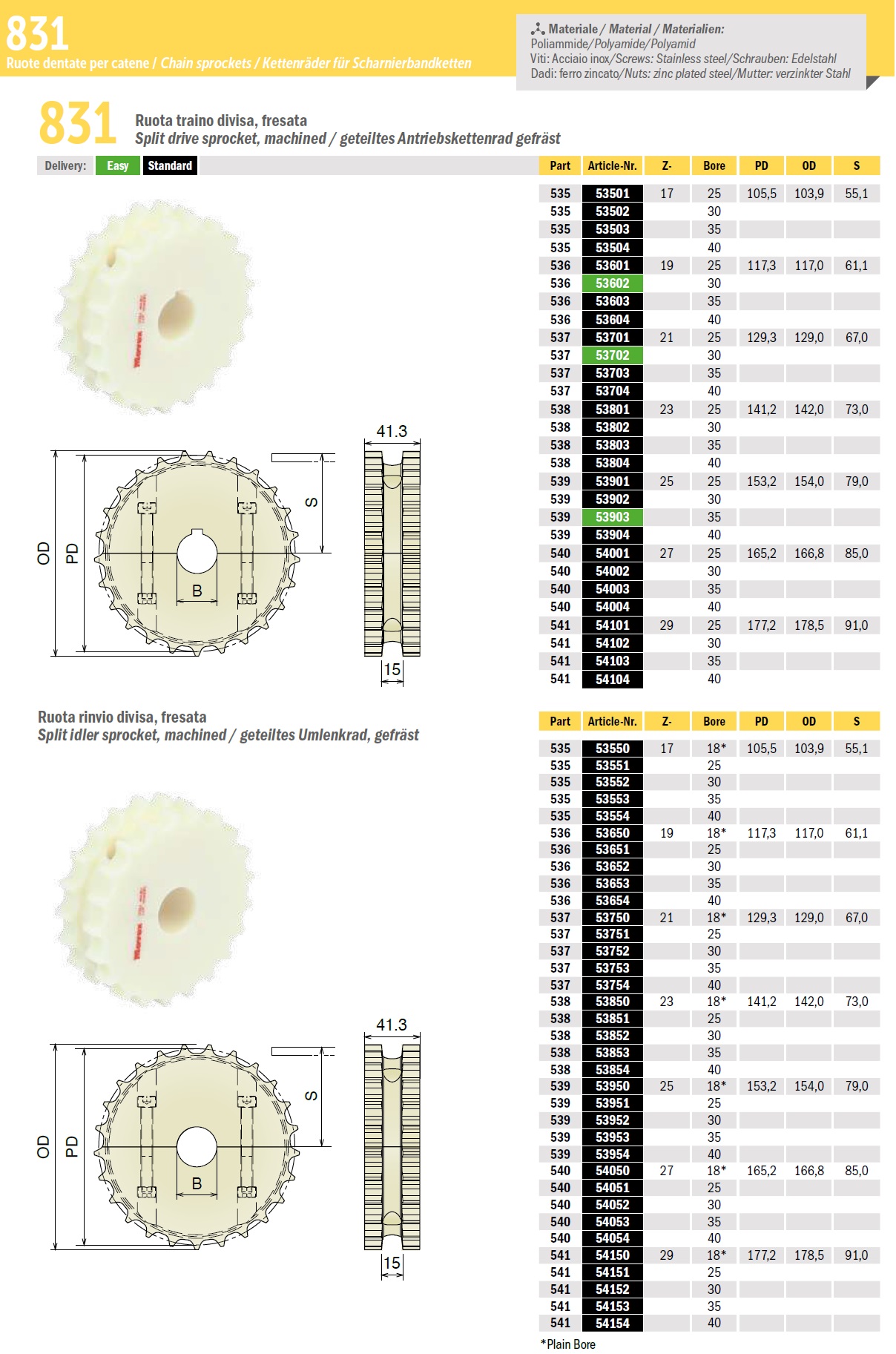 Ведущие и ведомые точеные звездочки 831 выпускаются максимальным диаметром 178.5мм, толщиной 41.3 мм (подробнее в характеристиках).