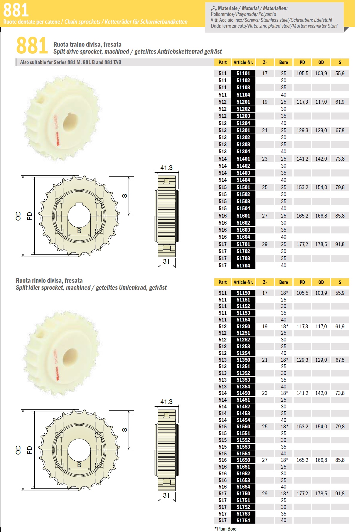 Приводная звездочка (ведущая) 881 серии изготавливаются из полиамидных пластмасс. Применяются для конвейеров с пластинчатыми цепями. Подходят для поворотных стальных лент 881M, 881 M GT, 881 B, 881 TAB, 8811 TAB, 8811 R TAB, 8811 TAB GT, 8811 B.