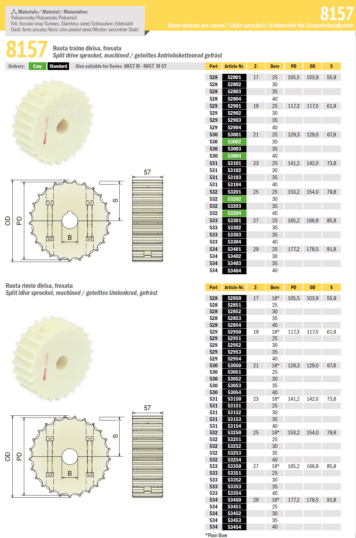 Приводная конвейерная звездочка звездочка 8157 серии изготавливается из высококачественной пластмассы. Применяются для конвейеров с пластинчатыми цепями. Подходят для прямоходных стальных лент 8157, 8157 GT. А также поворотных 8857 M, 8857 M GT.