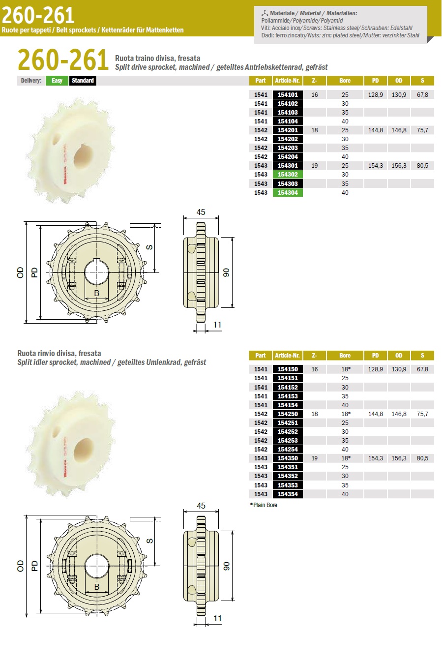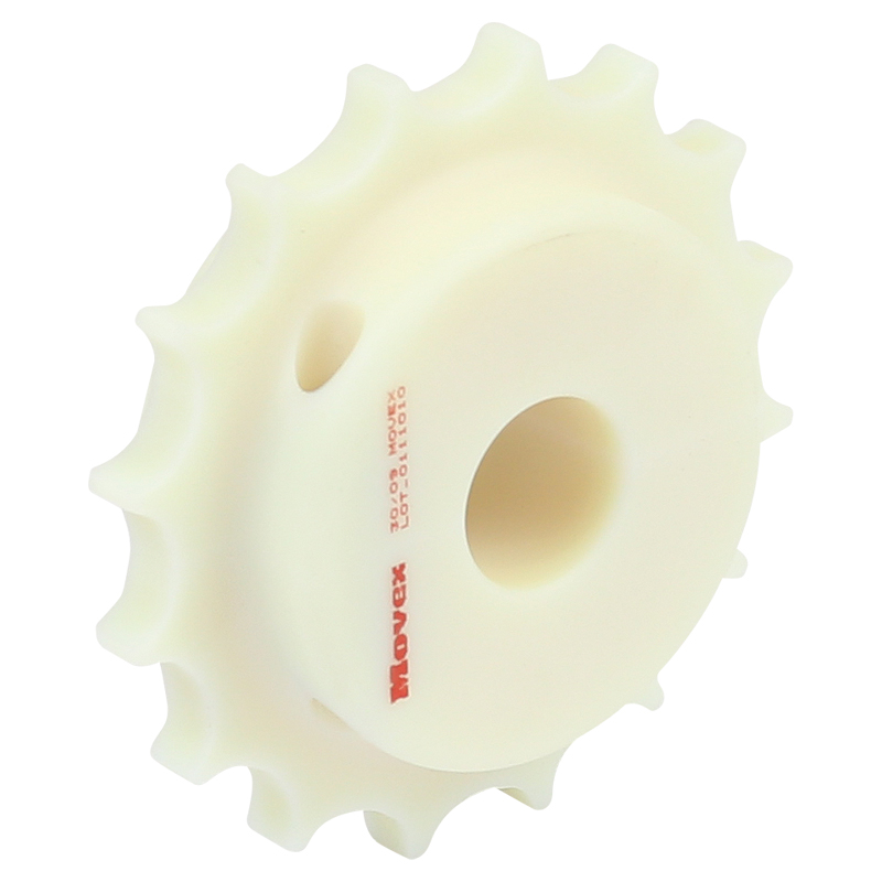 В наличии и под заказ доступен широкий ассортимент фрезерованных зубчатых ведущих колес, пассивных, разъемных пластмассовых шестеренок для пластинчатых цепей и модульных лент.