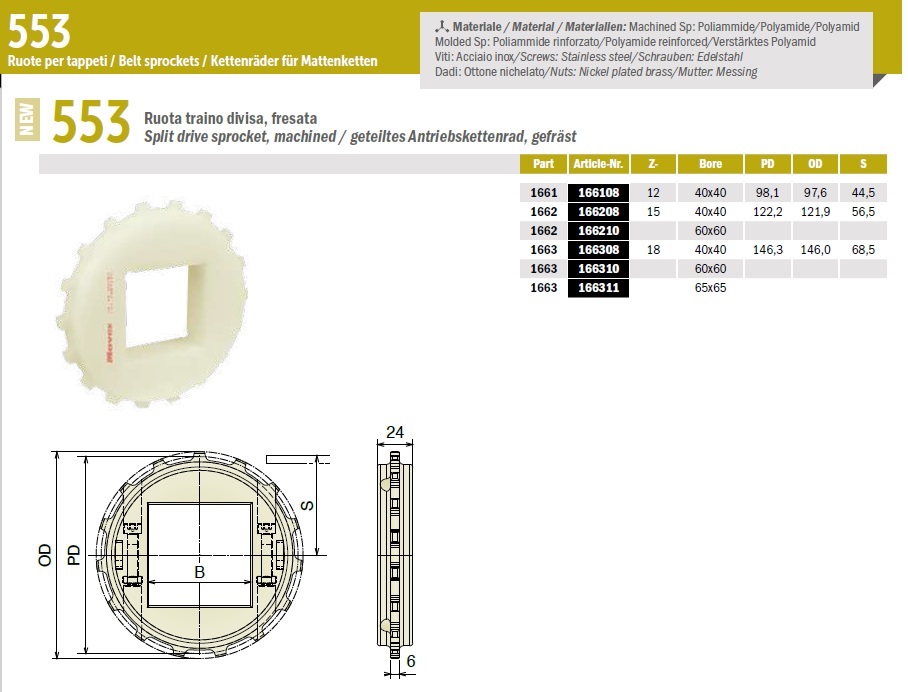 Звездочка для модульной ленты 553 Movex применяется для зацепления с конвейерным полотном. Центральное отверстие выполнено для квадратного вала. Габаритные и установочные размеры в характеристиках.