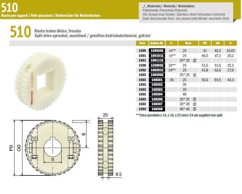 Звездочка 510 серии Movex применяется для зацепления с модульными лентами. Центральное отверстие выполнено для квадратного вала двигателя, возможно изготовление под круглый вал со шпоночным пазом. Габаритные и установочные размеры в характеристиках.