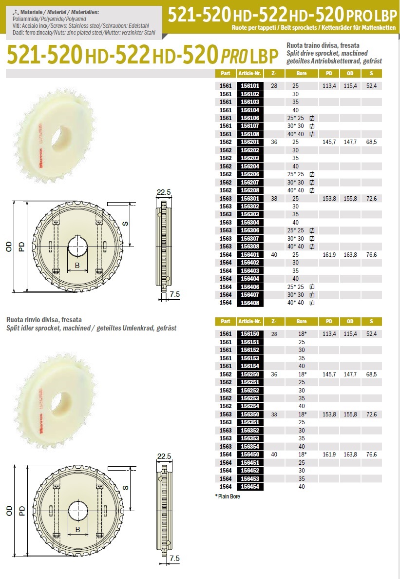 Звездочка для модульных лент 521-520 HD-522 HD-520 PRO LBP Movex применяется для зацепления с конвейерным полотном. Центральное отверстие может быть выполнено для круглого вала двигателя со шпоночным пазом и без, также возможно изготовление для квадратного вала. Габаритные и установочные размеры в характеристиках.